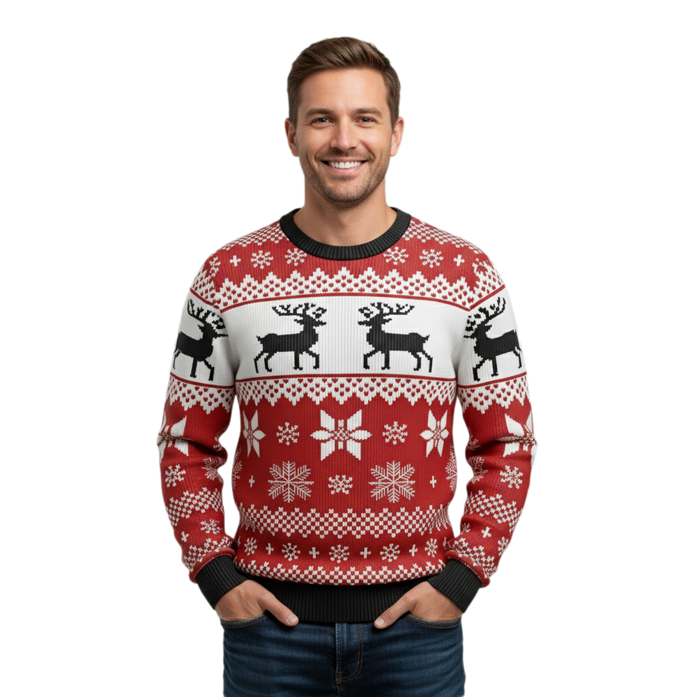 Classic Fair Isle Christmas Sweater – Red & White Reindeer Snowflake Pattern