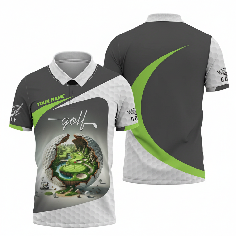 Personalized Mens Golf Polo Shirt Unique Golf Ball Scenic Design Gift for Dad Custom Name